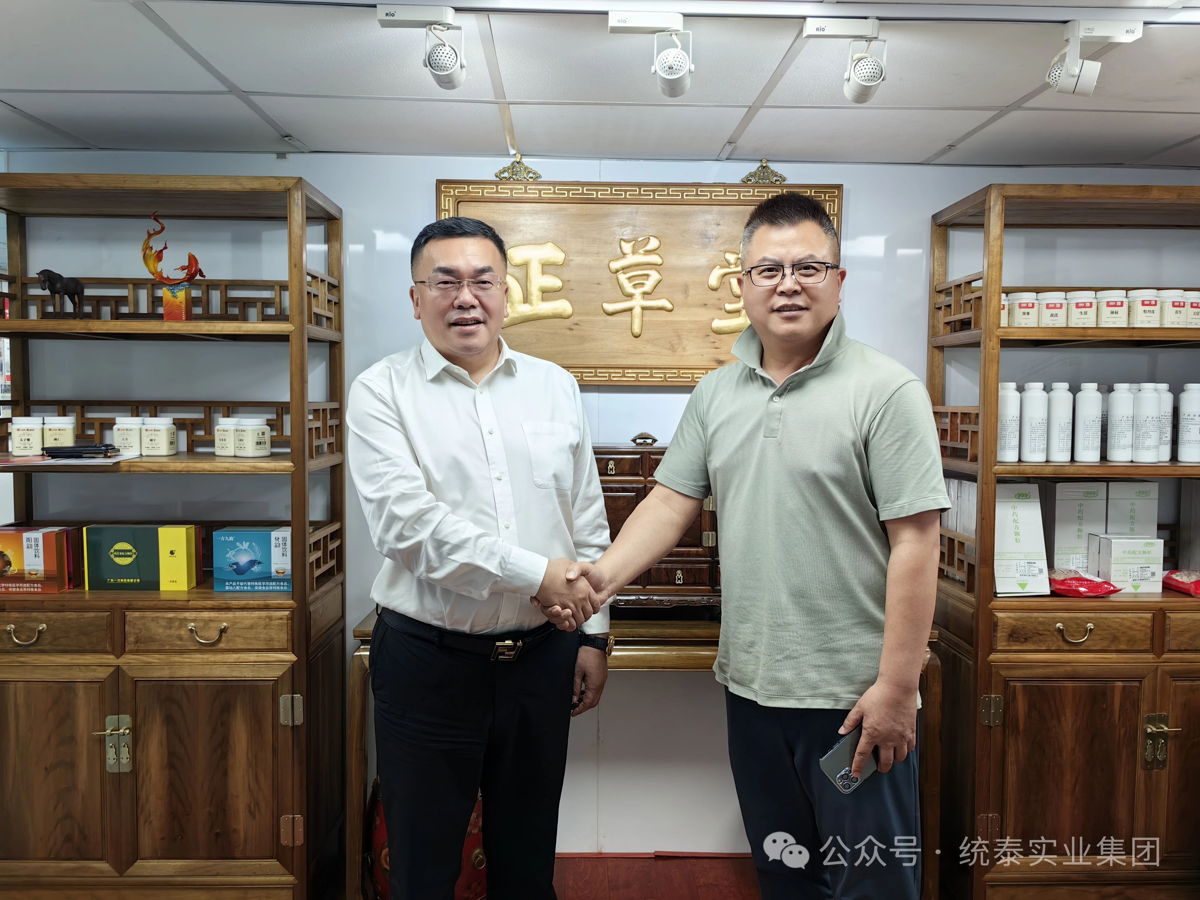 图一:统泰实业投资集团董事长杨棣(图左)与正草堂藥業香港有限公司董事长张立新(图右)亲切合影。