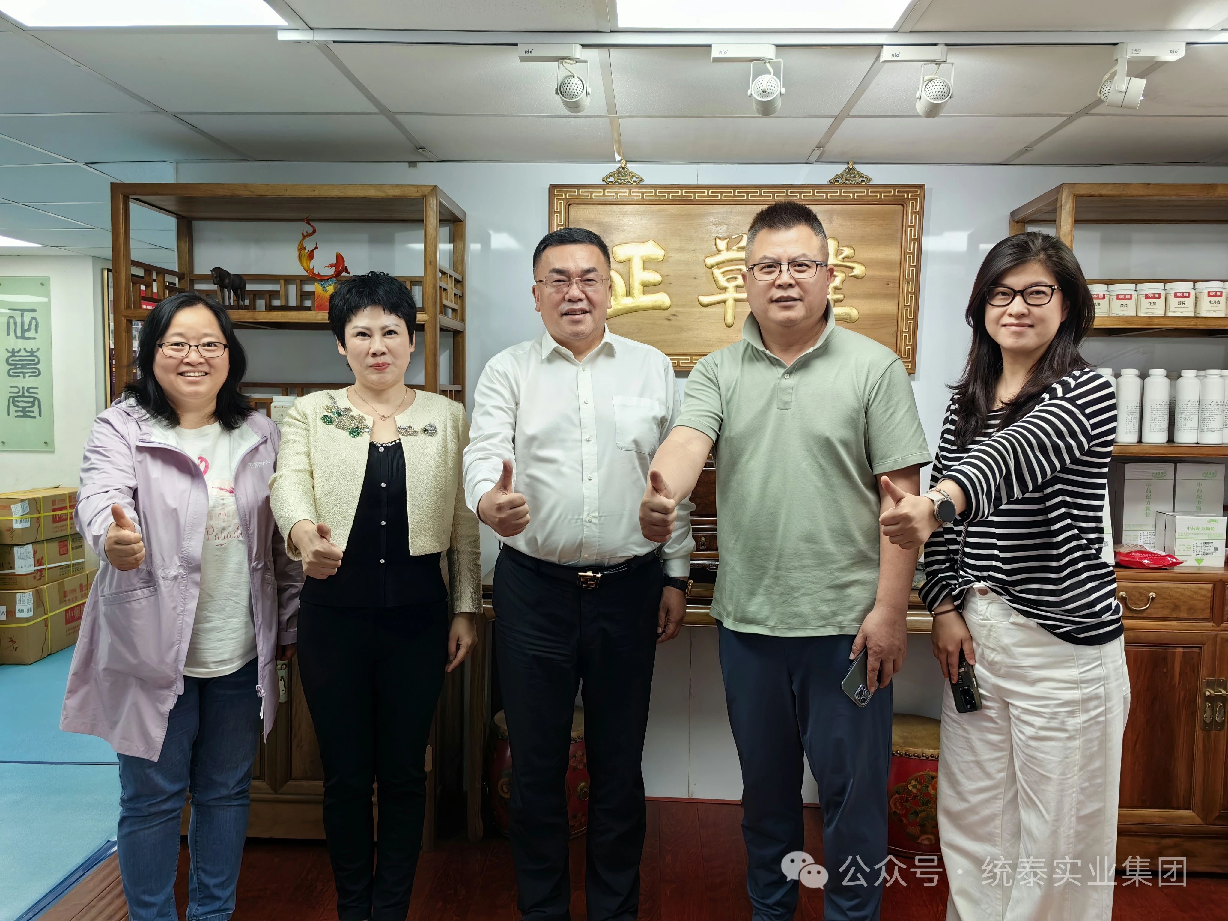 图二:统泰集团董事长杨棣(图中)、集团商业板块首席官张艳(左二)、集团工业板块首席官曲艳梅(左一)、集团董事李鹏飞(右一)与正草堂藥業香港有限公司董事长张立新(右二)合影留念。