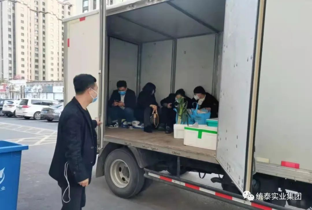由于疫情防控期间车辆上路限制,采买的蔬菜比较多,部分员工只能坐在漆黑的厢货车箱内,完成采买及分装工作后,双辽公司员工拖着疲惫的身体,到家的时候天色已经很晚了。虽然很苦、很累,但每个人都非常开心。在这个特殊的时期,能够帮助需要帮助的统泰家人们,双辽公司全体员工感觉无上的光荣和欣慰。